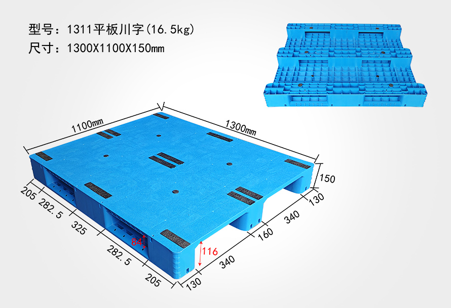 | 1311平板川字托盤(pán) | 1300*1100*150 | 16.5 | 2T | 6T | 8 |